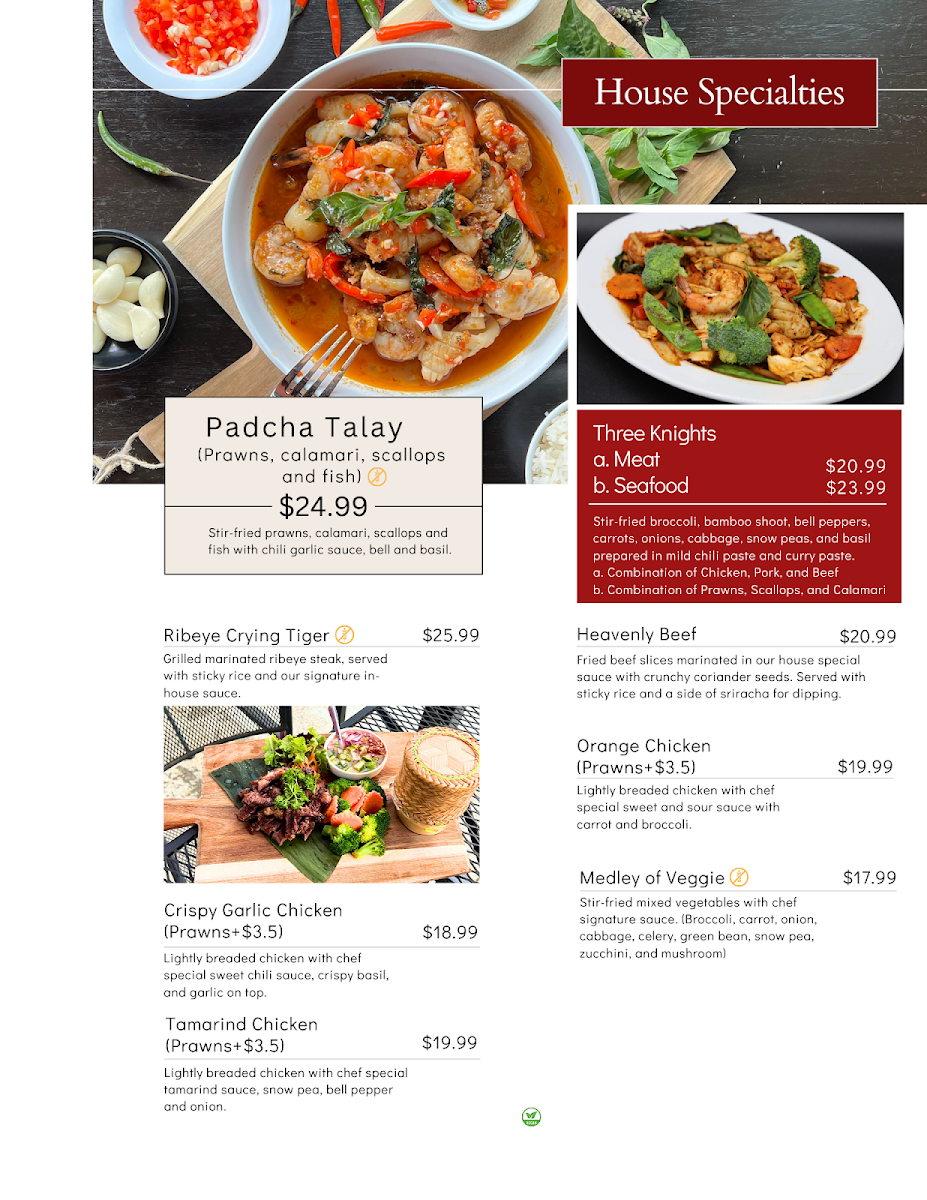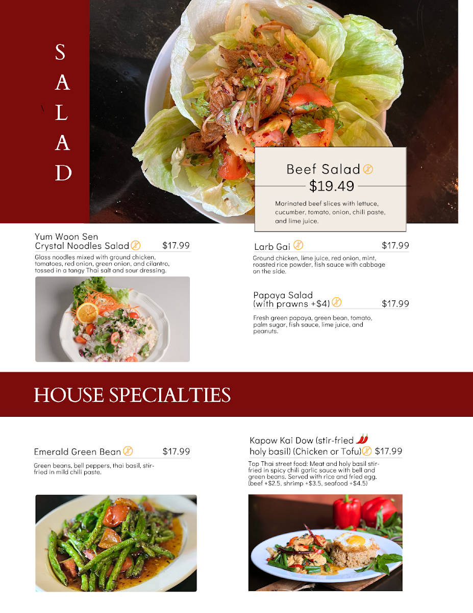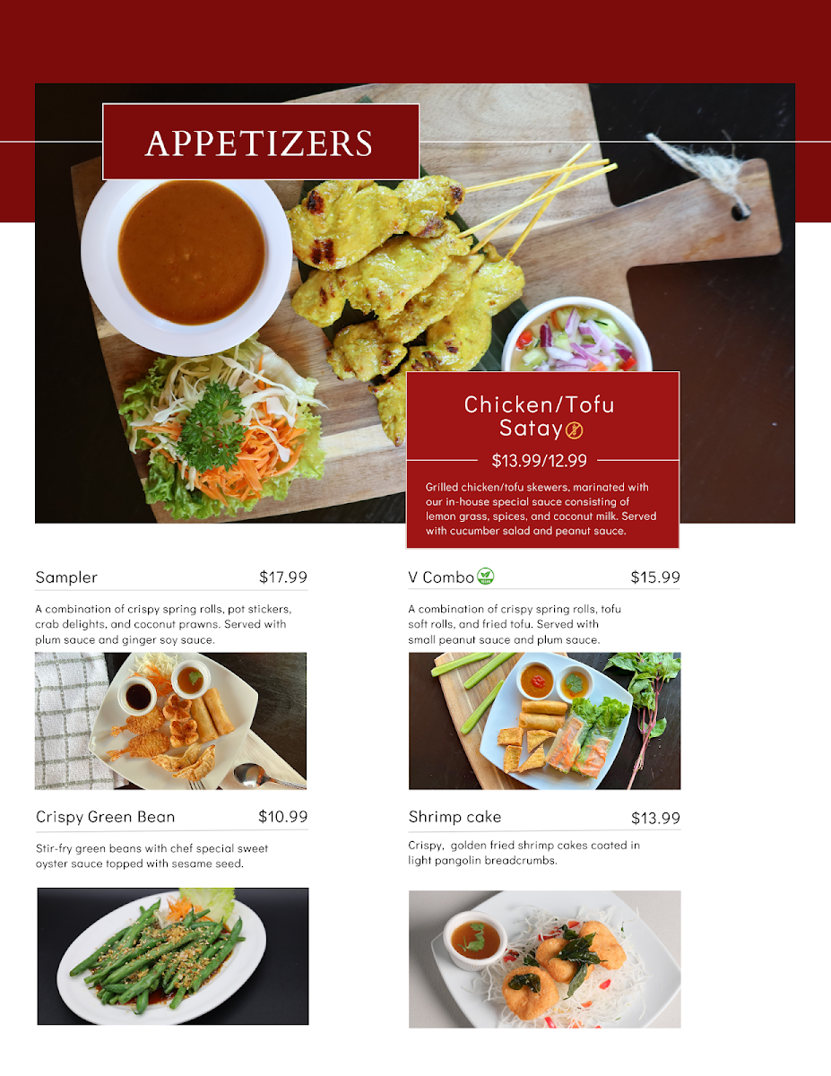 Each dish is crafted with the freshest ingredients, providing a perfect balance of spices and textures that Thai food is known for. With everything from traditional favorites to innovative new creations, the menu is designed to please those who love bold flavors and authentic taste. Plus, the welcoming atmosphere makes it an ideal place for both a casual meal or a special night out. Come explore the vibrant flavors that await you!